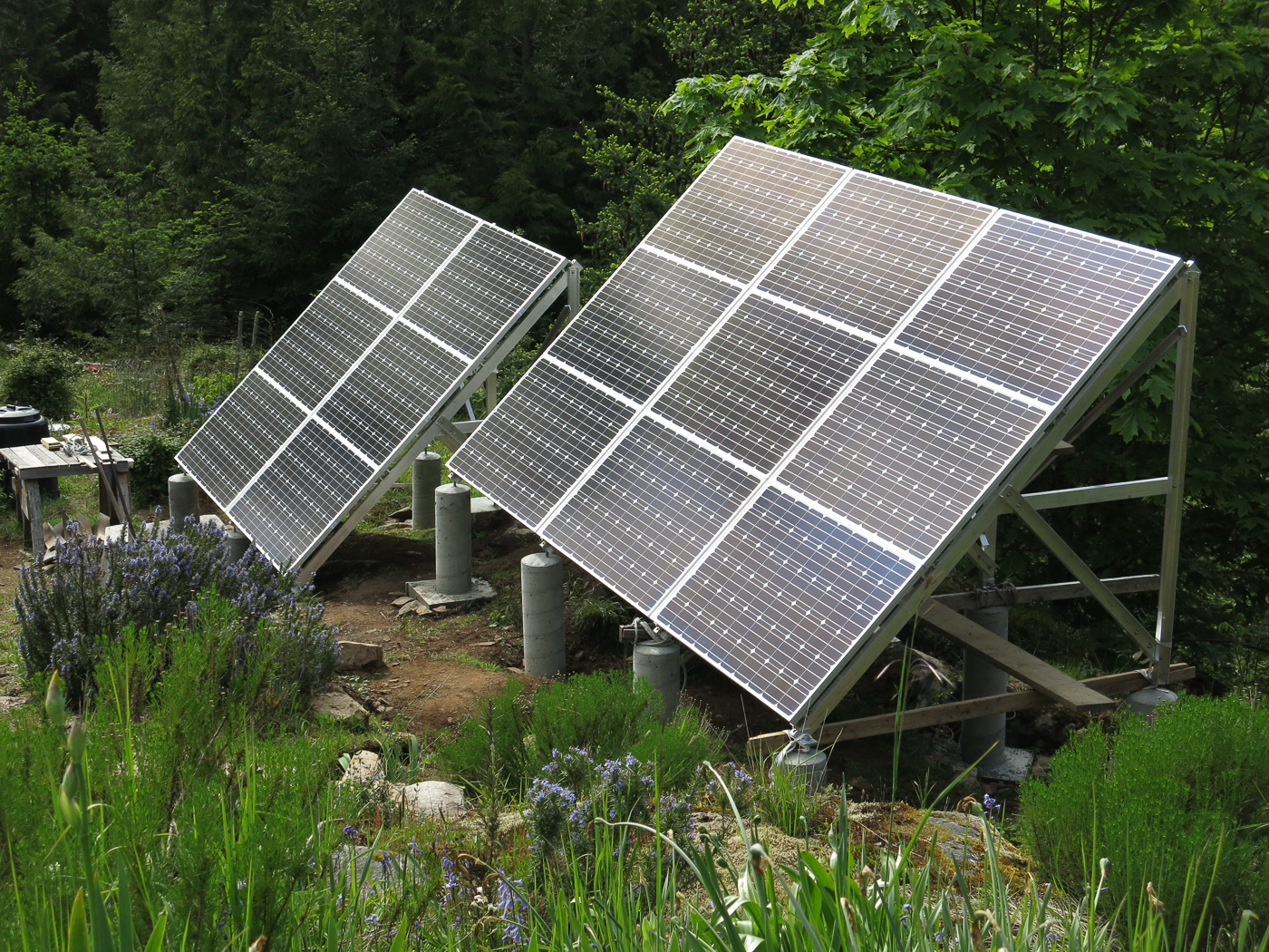 | WOW - done. 15 Panels with an electrical capacity of 4kW, weighing nearly 300kg. We both are proud that we managed to do it all without outside help, except for the concrete work. |
